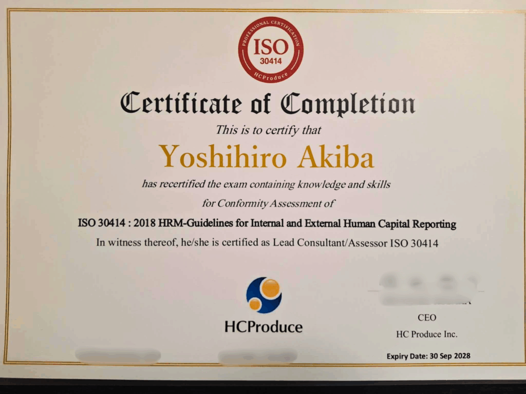 株式会社エイトシフトでは、代表の秋葉佳宏がISO 30414(人的資本情報開示)リードコンサルタント/アセッサー資格を取得いたしました。
